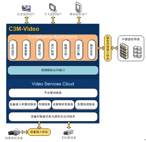 C3M-Video制訂相應的接入協議,與視頻設備、外部監控系統進行對接。設備智能辨認技能能在網絡內查找并辨認設備的類型,并方便地接入到渠道中。而虛擬化拜訪技能則將不一樣類型的設備,籠統成一樣的接口,可經過插件的方法完結對各類不一樣設備的動態支撐。